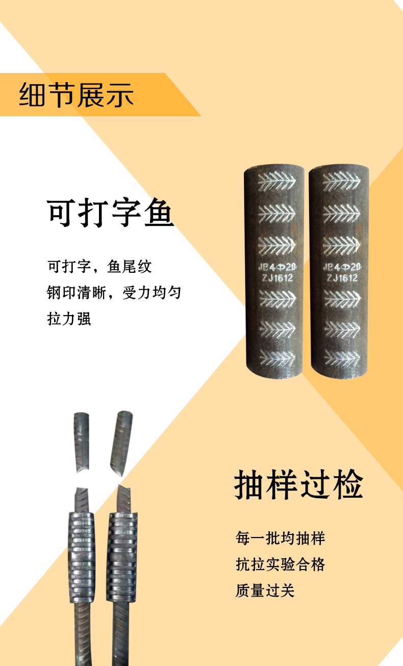 (5)外觀檢查不合格數(shù)小于檢查書的10%時(shí),該批接頭外觀質(zhì)量評(píng)定為合格,當(dāng)不合格數(shù)超過被檢查數(shù)的10%時(shí),應(yīng)對(duì)該批接頭逐個(gè)復(fù)檢,外觀檢查不合格的接頭應(yīng)該采取補(bǔ)救措施,不能補(bǔ)救的應(yīng)該做好標(biāo)記,并且在不合格的機(jī)頭中抽取3個(gè)試件作抗拉試驗(yàn),若有一個(gè)試件的強(qiáng)度低于設(shè)計(jì)值,則該批接頭不合格。